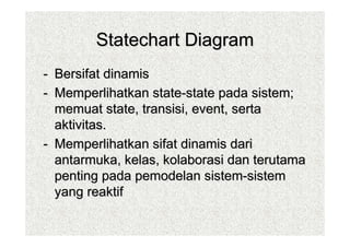 The document discusses state diagrams and state modeling. It explains that state diagrams are used to model the dynamic behavior of systems by showing their various states, transitions between states, events that trigger transitions, and activities within states. It provides examples of modeling the states of a single object and the sequence of states an object experiences over its lifetime. It also discusses modeling parallel and nested substates, as well as the use of events, guards, and actions in state transitions.