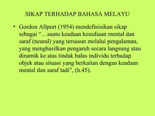 Dokumen ini membincangkan isu-isu semasa sikap terhadap bahasa Melayu, termasuk definisi sikap oleh Gordon Allport dan Kuper & Kuper serta jenis sikap kebahasaan dan nonkebahasaan. Terdapat cabaran terhadap bahasa Melayu seperti kejatuhan nilai dan jurang kelas, serta strategi untuk mengatasi sikap negatif seperti pembinaan budaya ilmu. Langkah susulan termasuk kempen dan promosi untuk menjadikan bahasa Melayu sebagai bahasa ilmu dan akademik.