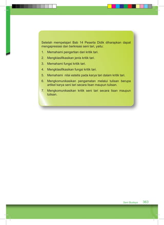 Dokumen ini membahas tentang kritik tari, mencakup pengertian, jenis, fungsi, serta nilai estetis dalam seni tari. Peserta didik diharapkan dapat mengapresiasi dan berkreasi dalam seni tari, memahami konsep kritik, serta menulis kritik seni tari melalui observasi. Selain itu, dokumen ini juga menjelaskan proses penulisan kritik tari yang meliputi deskripsi, analisis, interpretasi, dan evaluasi karya seni tari.