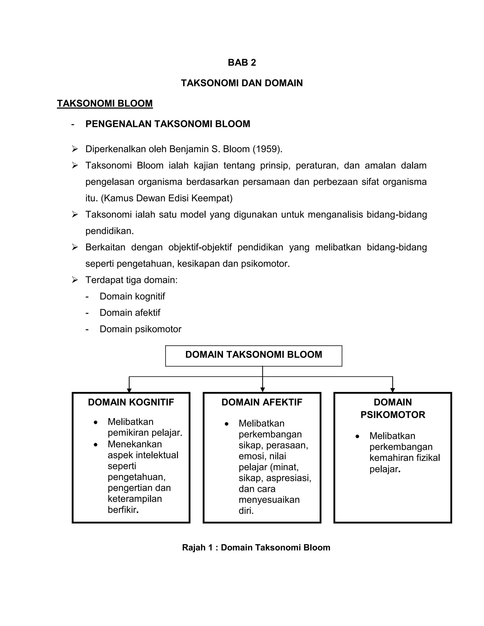 Teks tersebut membahasikan tentang taksonomi Bloom dan domain-domain yang terkandung didalamnya. Terdapat tiga domain utama iaitu domain kognitif, afektif dan psikomotor. Domain kognitif membahagikan enam aras pembelajaran mulai dari pengetahuan hingga penilaian. Manakala domain afektif pula terbahagi kepada lima peringkat iaitu penerimaan, tindak balas, penilaian, organisasi dan perwatakan.