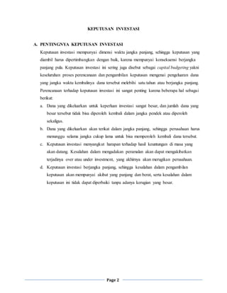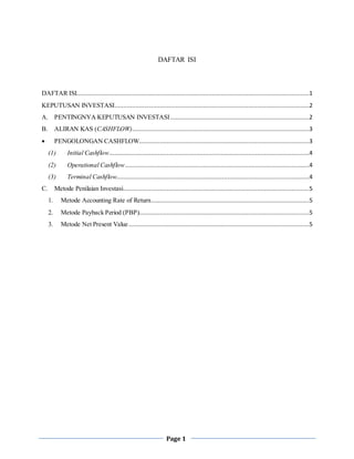 1. Dokumen membahas tentang pentingnya keputusan investasi jangka panjang dan metode-metode penilaian investasi seperti accounting rate of return, payback period, dan net present value.
