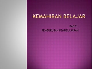 Matlamat pengurusan pembelajaran adalah untuk meningkatkan pencapaian pelajar dengan menguruskan masa dan sumber secara berkesan. Model pembelajaran individu dan teknik pengurusan masa seperti jadual dan penggunaan masa lapang penting untuk mencapai matlamat ini.
