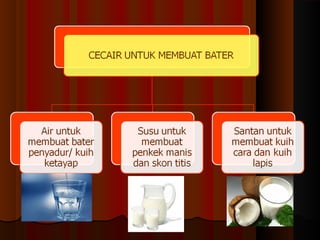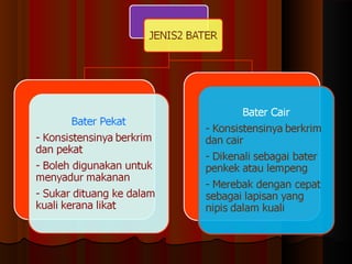Dokumen ini menjelaskan tentang pengertian bater, yang merupakan campuran tepung dengan cecair, serta jenis-jenisnya, yaitu bater cair dan pekat, dan memberikan sukatan serta contoh makanan yang boleh dihasilkan dari masing-masing jenis bater. Selain itu, terdapat panduan penyediaan bater dan beberapa soalan berkaitan untuk menilai pemahaman. Bater digunakan dalam pembuatan berbagai kuih dan makanan setelah diproses dengan cara yang sesuai.