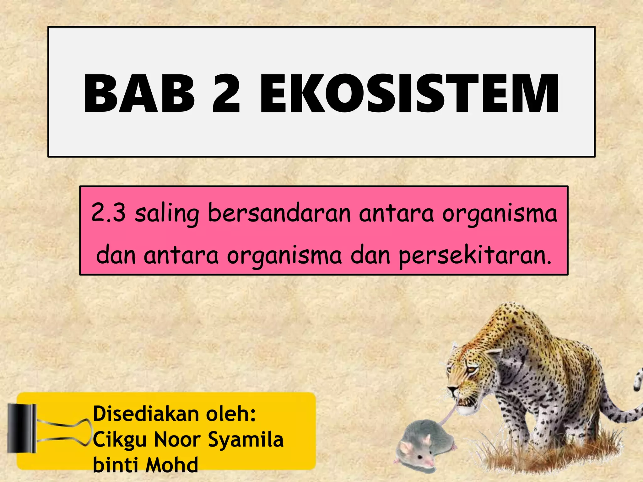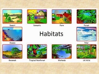 Dokumen ini membincangkan konsep asas ekosistem termasuk habitat, spesies, populasi, komuniti, dan saling bersandaran antara organisma serta persekitaran. Ia menerangkan bagaimana pelbagai jenis habitat mempengaruhi penyesuaian hidupan dalam keadaan ekstrem seperti gurun, tundra, dan tropika. Selain itu, dokumen ini menekankan kepentingan keseimbangan ekosistem dan interaksi antara komponen hidup dan bukan hidup.
