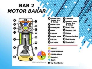 Dokumen tersebut membahas tentang motor bakar, meliputi pengertian, pembagian, klasifikasi, cara kerja, dan komponen utama motor bakar. Secara khusus dijelaskan mengenai motor bakar Otto (bensin), diesel, dan Wankel beserta perbandingan prinsip kerjanya.