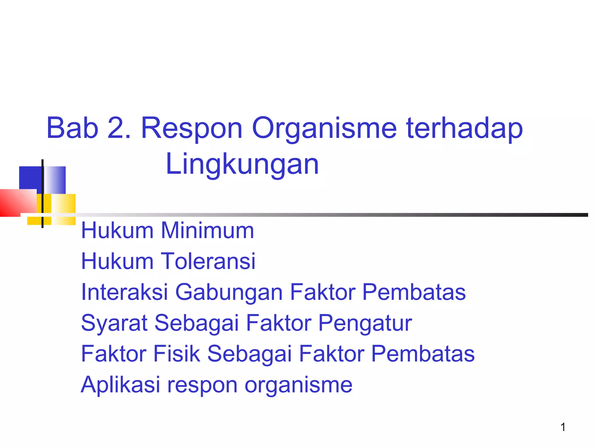 Bab 2 membahas respon organisme terhadap lingkungan berdasarkan hukum minimum, toleransi, dan interaksi faktor lingkungan. Organisme dapat hidup pada rentang minimum hingga maksimum dari faktor lingkungan seperti suhu, cahaya, dan air."