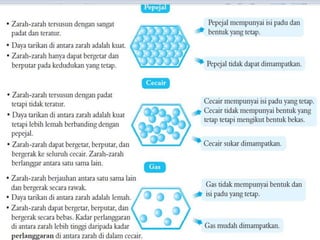 Bab ini membincangkan struktur atom dan jirim, termasuk jenis-jenis jirim seperti atom, molekul, dan ion. Ia menerangkan model-model atom yang telah dikemukakan oleh saintis seperti Dalton, Thomson, Rutherford, Bohr, dan Chadwick. Selain itu, tajuk menyentuh tentang isotop, kepentingannya dalam kehidupan, serta susunan elektron dalam atom.