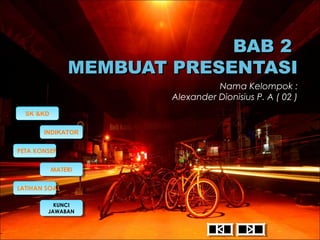 Dokumen ini memberikan panduan tentang cara membuat presentasi menggunakan Microsoft PowerPoint, mencakup langkah-langkah dalam membuat dokumen baru, mengganti layout slide, serta menambahkan teks dan gambar. Terdapat juga indikator kompetensi dasar yang harus dikuasai siswa, seperti penggunaan themes dan berbagai jenis teks dalam presentasi. Di akhir dokumen, terdapat latihan soal untuk menguji pemahaman siswa mengenai materi yang telah diajarkan.