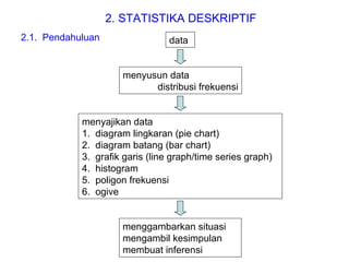 Dokumen ini membahas tentang statistika deskriptif yang mencakup cara menyusun data distribusi frekuensi dengan menggunakan berbagai bentuk visualisasi seperti diagram lingkaran, diagram batang, dan histogram. Ditegaskan bahwa distribusi frekuensi dapat digunakan untuk data kualitatif dan kuantitatif, baik yang tidak dikelompokkan maupun yang dikelompokkan sesuai kebutuhan data. Selain itu, prosedur pembuatan tabel distribusi frekuensi juga dijelaskan dengan contoh-contoh praktis terkait pengolahan data.
