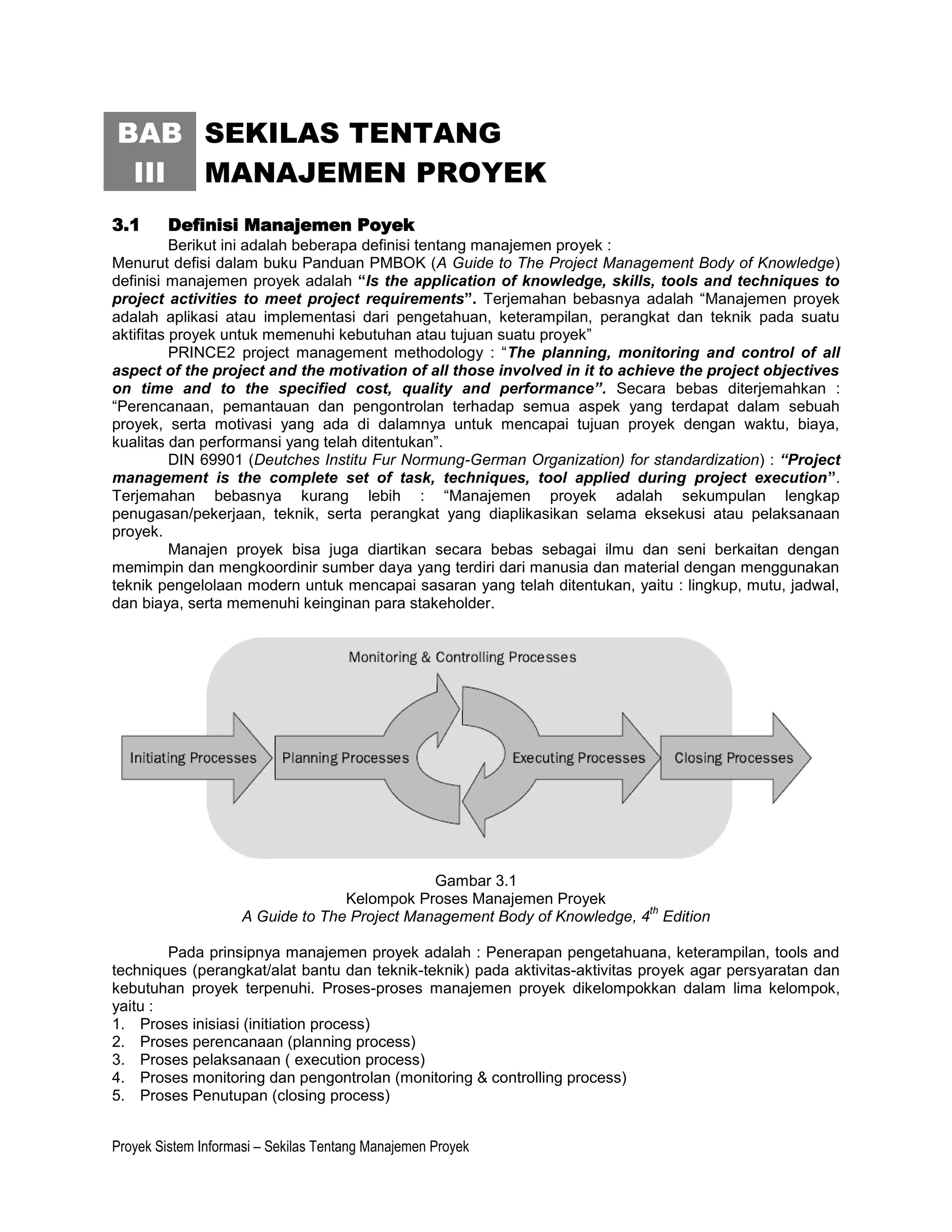Manajemen proyek adalah penerapan pengetahuan, keterampilan, alat, dan teknik untuk memenuhi tujuan proyek, dengan lima kelompok proses yaitu inisiasi, perencanaan, pelaksanaan, monitoring, dan penutupan. Kerangka kerja manajemen proyek mencakup pengelolaan ruang lingkup, waktu, biaya, kualitas, dan risiko yang terintegrasi untuk mencapai keberhasilan proyek. Tiga faktor pembatas (scope, time, cost) saling terkait, dan optimasi ketiga komponen ini penting untuk mencapai kualitas yang diinginkan dalam proyek.