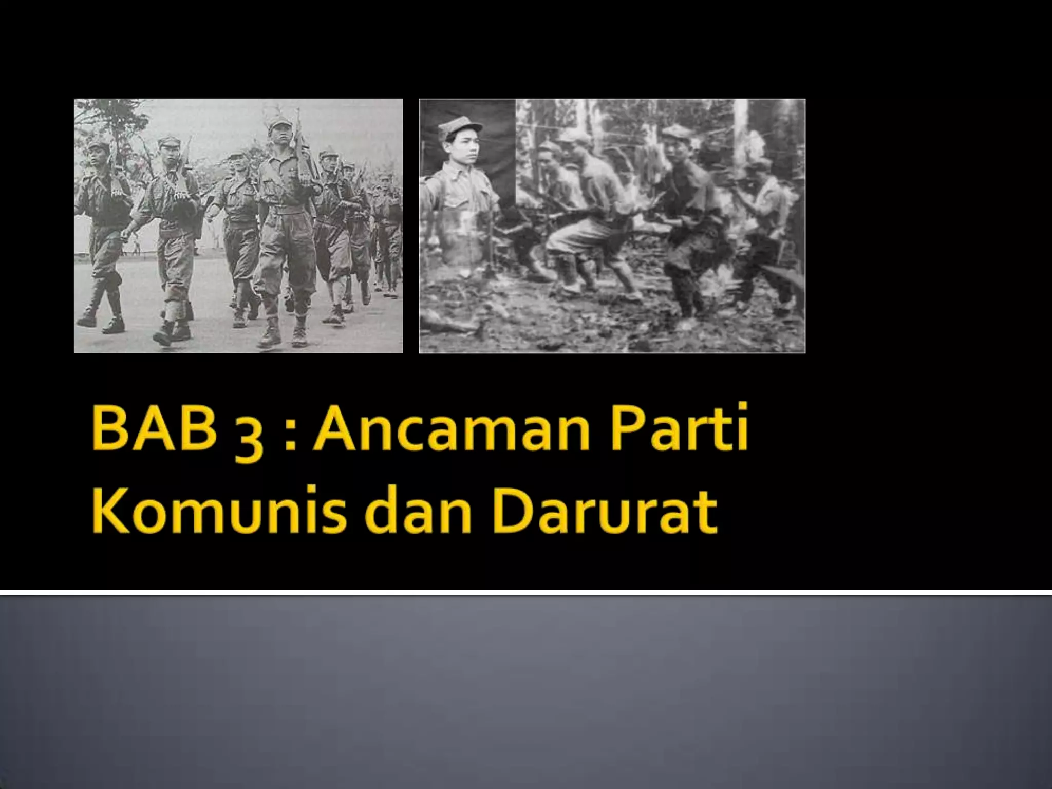 Komunisme diasaskan oleh Karl Marx pada abad ke-19. Fahaman ini menentang sistem feudal dan imperialis dengan menggunakan kekerasan, dan memperjuangkan masyarakat tanpa kelas yang memiliknegarakan ekonomi. Parti Komunis Malaya ditubuhkan pada 1930 untuk menubuhkan Republik Komunis Malaya, dan berperanan membantu British menentang Jepun semasa perang. Walau bagaimanapun, selepas perang, PKM memulakan pemberont