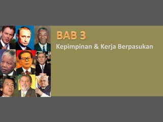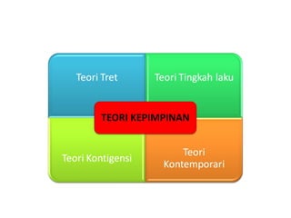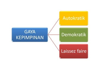 Dokumen ini membahas konsep dan faktor-faktor kepimpinan, termasuk kemahiran dan prinsip yang diperlukan untuk meningkatkan keberkesanan kepimpinan. Ia menguraikan hubungan antara pemimpin dan pengikut serta pendekatan dan gaya kepimpinan yang sesuai bergantung kepada situasi. Selain itu, dokumen ini menyentuh tentang sifat-sifat pemimpin yang berkesan serta pelbagai teori dan model kepimpinan.
