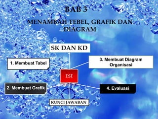 Dokumen ini menjelaskan cara membuat tabel, grafik, dan diagram organisasi menggunakan aplikasi Microsoft PowerPoint. Langkah-langkah meliputi penggunaan tab insert, memilih jenis tabel atau grafik, dan mengedit diagram menggunakan fitur desain. Evaluasi menyangkut pengenalan perangkat keras dan identifikasi menu serta ikon dalam perangkat lunak pengolah presentasi.