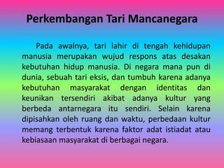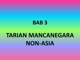 Dokumen tersebut membahas berbagai jenis tari pertunjukan mancanegara non-Asia seperti tari dari Brasil, Inggris, Meksiko, Portugal, dan beberapa negara lain. Jenis tari tersebut meliputi tari kapuera, chachacha, salsa, flamenco, dan street dance. Beberapa tari seperti salsa dan flamenco ditarikan secara berpasangan dan diiringi alat musik tradisional.