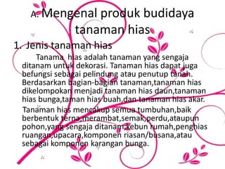 Bab 3 membahas tentang budidaya dan wirausaha tanaman hias. Terdapat beberapa jenis tanaman hias seperti tanaman hias daun, bunga, buah, dan akar. Budidaya tanaman hias memerlukan sarana seperti benih, media tanam, pupuk, dan peralatan seperti cangkul, gembor. Wirausaha tanaman hias membutuhkan karakter seperti percaya diri, berani mengambil resiko, dan kreativitas.