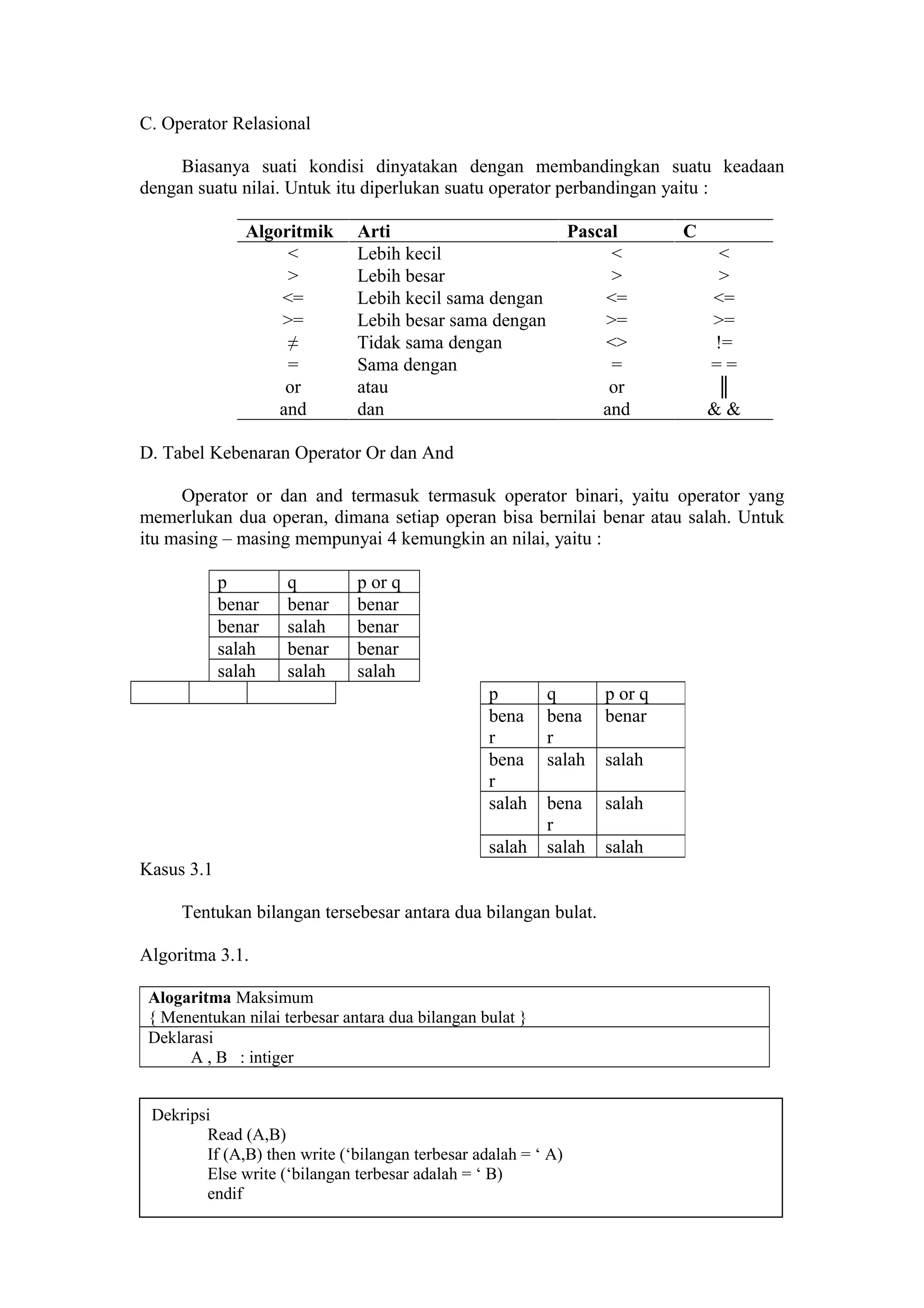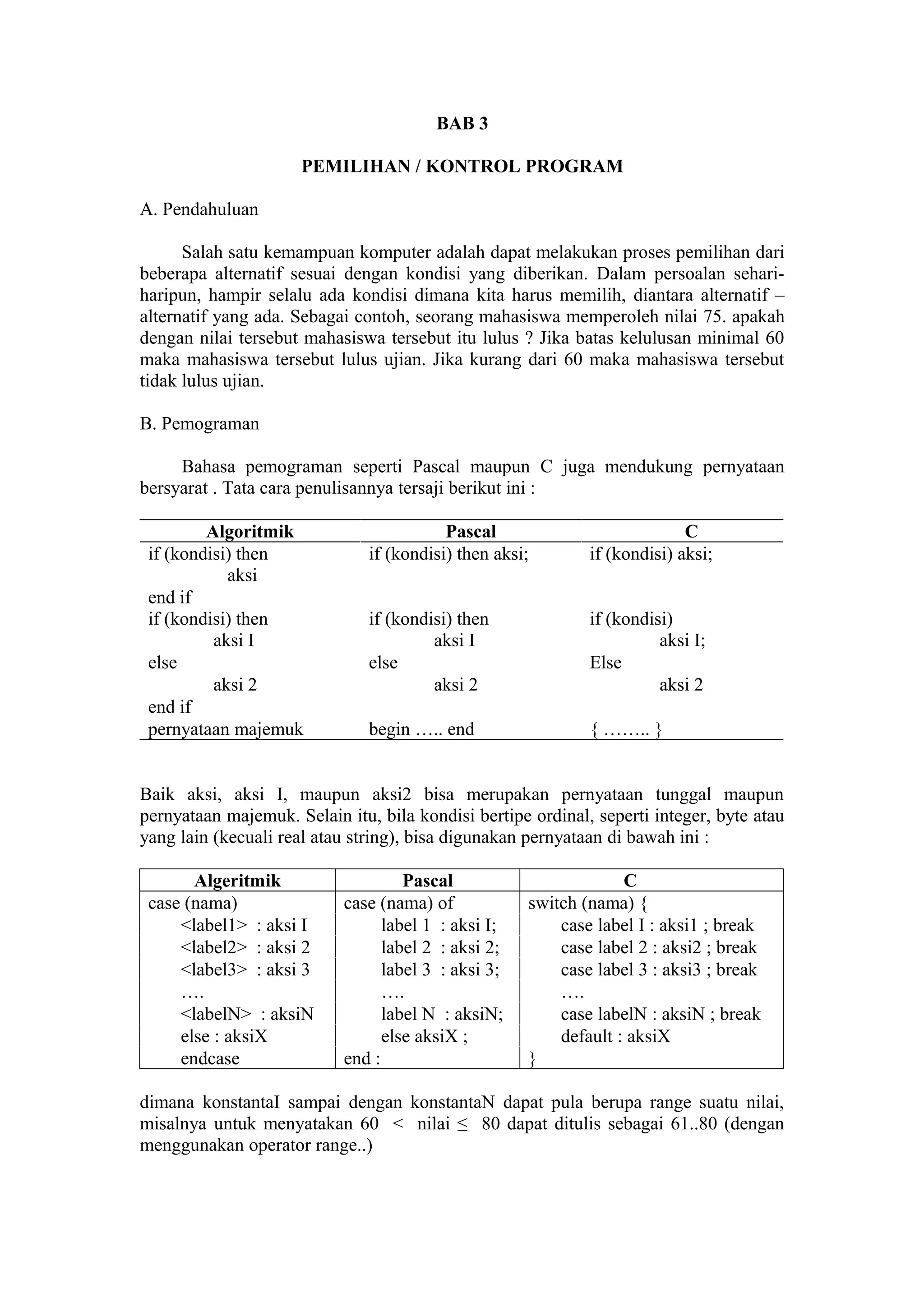 Dokumen ini membahas tentang algoritma pemilihan dan kontrol program dalam bahasa pemrograman. Terdapat beberapa kasus yang dijelaskan seperti menentukan bilangan terbesar dari dua dan tiga bilangan, menghitung akar kuadrat dari persamaan kuadrat, dan mengkonversi nilai angka menjadi nilai huruf.