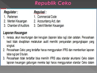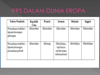 Standar akuntansi berbeda di berbagai negara Eropa. Di Jerman, regulator utama adalah DRSC dan GASC, sedangkan regulasi utamanya adalah German Commercial Code. Laporan keuangan Jerman terdiri atas neraca, laporan laba rugi, catatan, dan laporan auditor. Di Belanda, regulator utama adalah DASB, AMF, dan NivRA, dengan regulasi utama berupa Undang-Undang tentang Laporan Keuangan Tahunan 1970. Laporan keuangan Belanda meliputi neraca, laporan