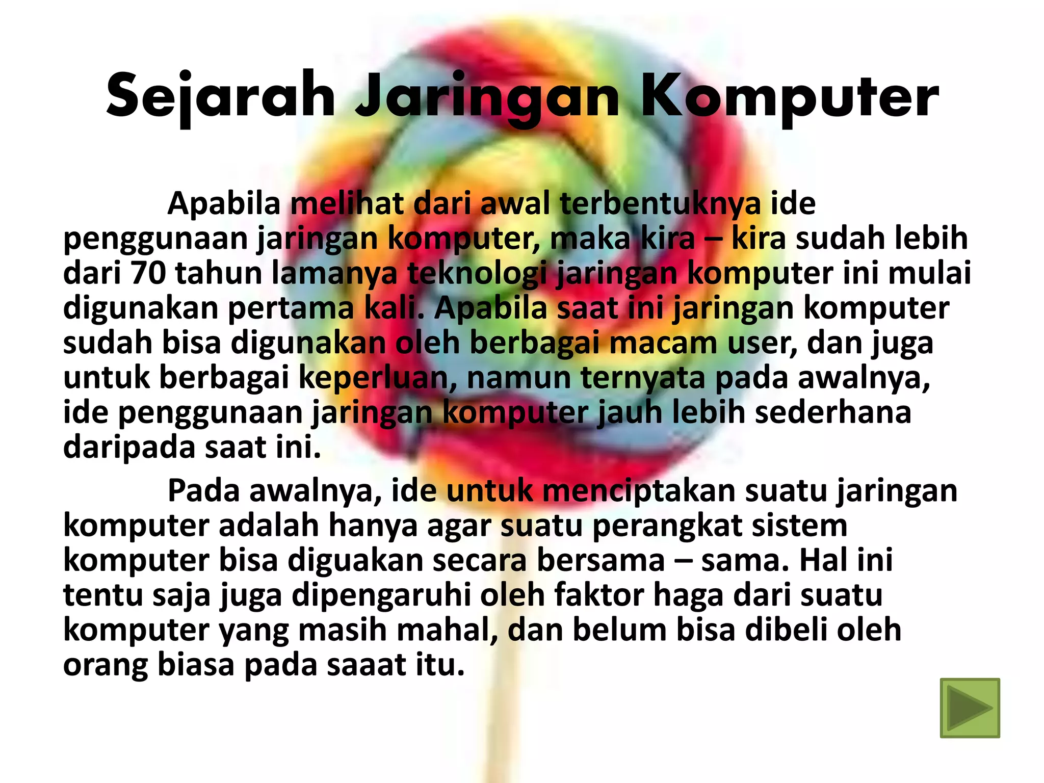 Dokumen ini menjelaskan sejarah jaringan komputer mulai dari ide awalnya lebih dari 70 tahun yang lalu hingga pengembangan teknologi terkini. Pada awalnya, jaringan komputer dirancang untuk memungkinkan penggunaan bersama dari perangkat, yang berlanjut dengan perkembangan sistem batch processing di 1940-an dan time sharing system di 1950-an. Akhirnya, perkembangan internet dan World Wide Web di 1973 dan 1990-an merevolusi cara komputer terhubung dan bertukar informasi di seluruh dunia.