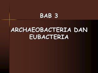 Dokumen ini menjelaskan tentang archaeobacteria dan eubacteria, termasuk karakteristik, klasifikasi, dan peranannya dalam kehidupan. Archaeobacteria merupakan organisme prokariotik yang hidup di lingkungan ekstrim, sedangkan eubacteria memiliki habitat yang lebih bervariasi dan dapat dibedakan berdasarkan kebutuhan oksigen serta cara memperoleh makanan. Keduanya memiliki peranan penting baik sebagai pengurai, dalam produksi gas metana, maupun dalam proses pembuatan makanan dan antibiotik.