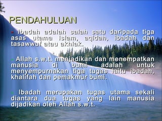 Ibadah dalam Islam adalah salah satu asas utama, yang melibatkan pengabdian diri sepenuhnya kepada Allah dan mencakup seluruh aspek kehidupan manusia. Ibadah ini dikategorikan kepada berbagai jenis, termasuk fardhu, sunat, dan umum, serta dilakukan dengan ikhlas dan mengikuti tuntutan yang ditetapkan. Ruang lingkup ibadah sangat luas, mencerminkan hubungan erat antara aqidah dan amal, serta menegaskan tujuan hidup sebagai pengabdian kepada Allah.