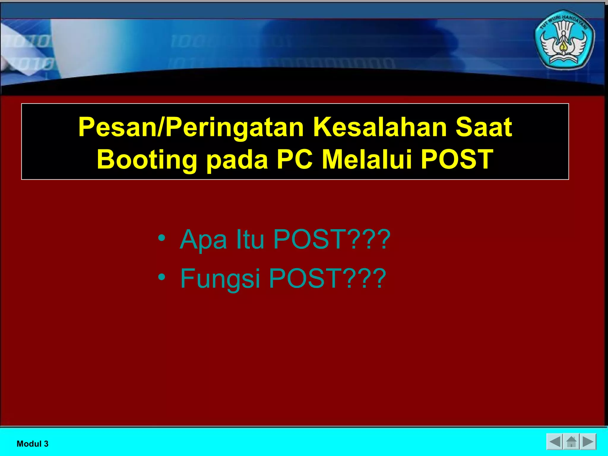 Dokumen ini membahas tentang POST (Power on Self-Test) yang merupakan tes yang dilakukan PC untuk mengecek komponen-komponennya saat menyala. POST memungkinkan pengguna mendeteksi masalah hardware melalui kode beep dan pesan kesalahan. Kode beep untuk mendeteksi masalah berbeda antara BIOS AWARD, AMI, dan IBM.