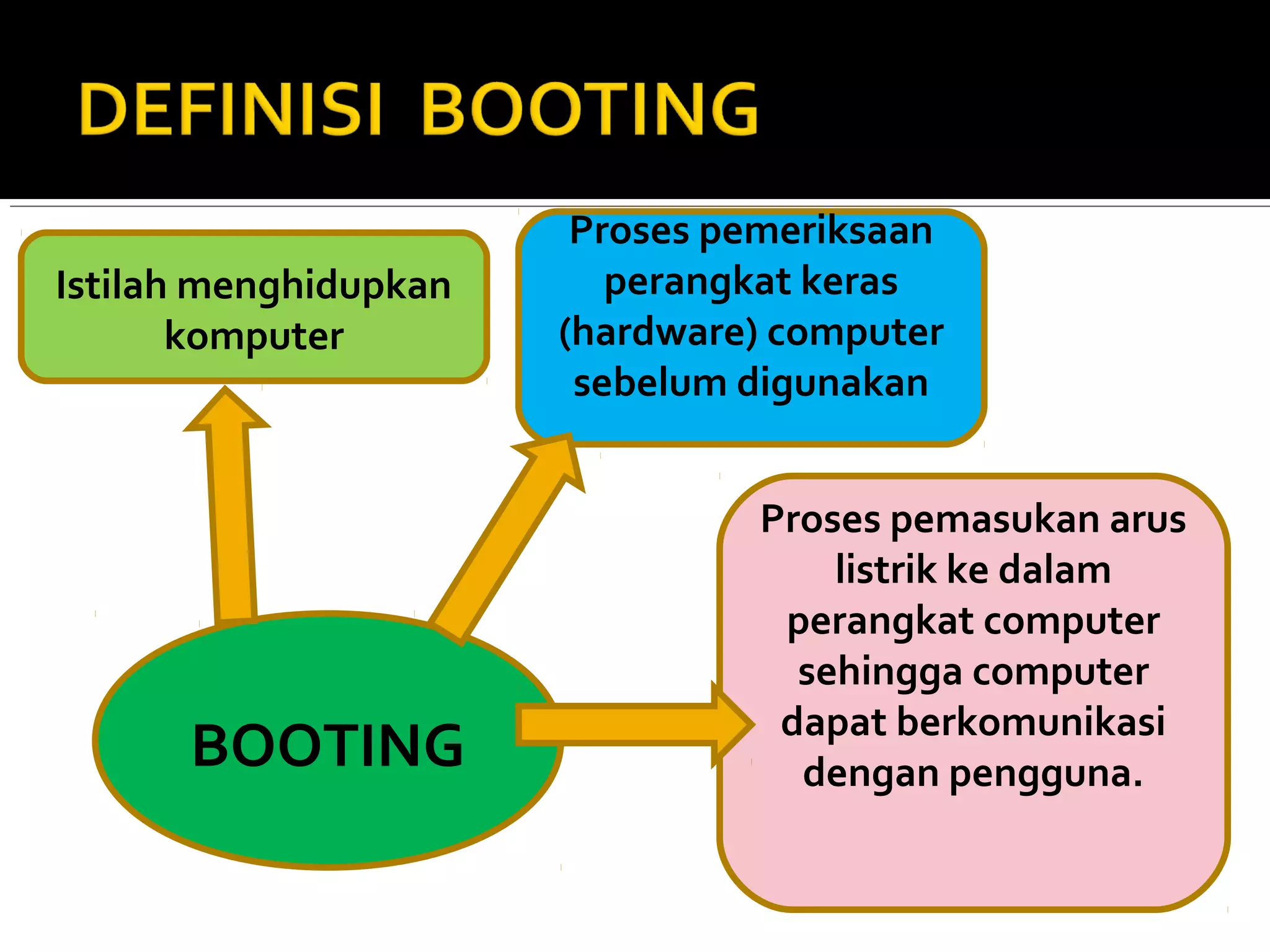 Dokumen tersebut menjelaskan proses booting komputer, dimulai dari BIOS yang melakukan pengecekan perangkat keras, memuat sistem operasi, dan memulai proses boot pada drive yang ditentukan sesuai urutan boot. Proses ini meliputi pengecekan memori, hardware, dan perangkat Plug and Play sebelum memuat sistem operasi.