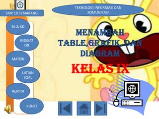 SMP 18 Semarang membahas tentang menambahkan tabel, grafik, dan diagram pada presentasi PowerPoint. Materi ini mencakup cara membuat tabel, grafik kolom, dan diagram organisasi serta latihan soal untuk mengevaluasi pemahaman siswa.
