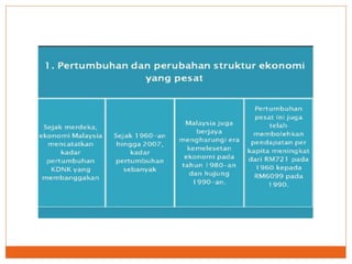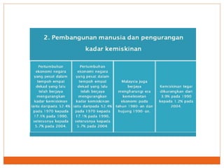 Dasar Ekonomi Baru bermatlamat mewujudkan perpaduan nasional dengan mengurangkan ketidakseimbangan ekonomi antara etnik. Ia menekankan pembasmian kemiskinan dan penyusunan semula masyarakat untuk meningkatkan pegangan ekuiti bumiputera dalam sektor korporat serta membuka peluang pekerjaan kepada semua kaum. Walaupun mencapai kejayaan ekonomi, isu ketaksamarataan pendapatan masih w