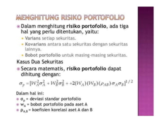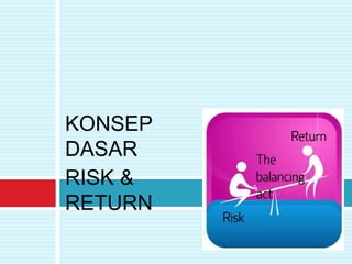 Dokumen ini membahas konsep dasar hubungan risiko dan return dalam pengambilan keputusan keuangan. Sebuah aset dengan risiko yang lebih tinggi diharapkan memberikan return yang lebih besar, sementara risiko dapat diukur dengan deviasi standar dan koefisien variasi. Selain itu, konsep risiko sistematis dan tidak sistematis serta penggunaan model CAPM untuk analisis risiko dan return juga dibahas.