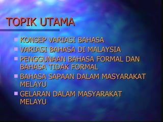 Dokumen ini membahas variasi bahasa di Malaysia, yang dipengaruhi oleh faktor geografi, sosial, dan konteks. Terdapat perbezaan dalam penggunaan bahasa formal dan tidak formal serta sistem sapaan dalam masyarakat Melayu yang mencerminkan kesopanan dan hubungan sosial. Gelaran dalam masyarakat Melayu juga dijelaskan, termasuk gelaran warisan, kurniaan, dan peribadi.