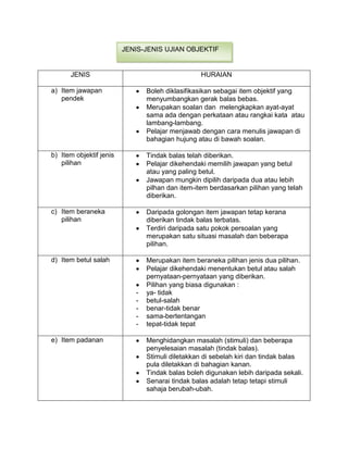 Bab 4 membahas tentang pembinaan ujian yang terdiri dari ujian objektif dan subjektif. Ujian objektif berupa pilihan ganda atau isian singkat yang dapat dinilai secara objektif. Ujian subjektif berupa esei yang menilai kualitas jawaban siswa secara subjektif. Kedua jenis ujian memiliki kelebihan dan kelemahan masing-masing.