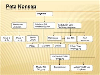 Dokumen ini membahas konsep lingkaran, termasuk definisi, persamaan, luas, dan kedudukan titik serta garis terhadap lingkaran. Contoh diberikan untuk berbagai situasi, seperti menentukan persamaan lingkaran dan garis singgung dari titik yang berbeda. Selain itu, terdapat metode untuk menentukan kedudukan titik dan garis terhadap lingkaran berdasarkan diskriminan.