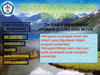 Dokumen ini merupakan panduan untuk siswa SMP Negeri 18 Semarang mengenai penggunaan program presentasi PowerPoint, termasuk cara menambah animasi, mengatur efek perpindahan slide, dan menambahkan file multimedia seperti video dan sound. Siswa juga diajarkan untuk mempresentasikan dengan berbagai opsi, serta jawaban untuk soal yang berkaitan dengan materi. Fokus utama adalah keterampilan praktis dalam membuat presentasi yang menarik dan interaktif.