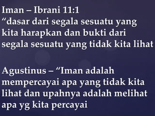 Dokumen ini membahas tentang iman sejati dalam konteks ajaran Kristen, menekankan tiga unsur iman: notitia (pengetahuan), assensus (keyakinan), dan fiducia (penyerahan diri). Iman tidak hanya berupa pengetahuan intelektual tetapi juga melibatkan penghayatan dan tindakan nyata yang ditunjukkan melalui ketaatan kepada Tuhan. Dalam proses keselamatan, iman adalah jembatan yang membawa kepada keselamatan sejati melalui Yesus Kristus dan diimbangi dengan pertobatan yang tulus.