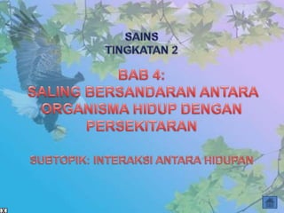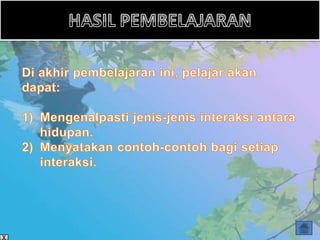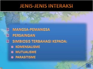 Dokumen menjelaskan jenis-jenis interaksi antara organisma hidup seperti persaingan, mangsa-pemburu, mutualisme, komensalisme dan parasitisme serta contoh-contohnya. Dokumen ini juga mengandungi soalan-soalan ujian mengenai jenis interaksi.