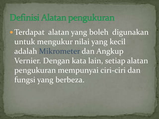 Dokumen ini memberikan penjelasan mengenai alat pengukuran mikrometer dan cara penggunaannya. Mikrometer digunakan untuk mengukur nilai yang sangat kecil dengan ketelitian tinggi. Terdiri dari bingkai, spindal, bidal, dan andas. Bacaan diambil dari laras atas, bawah, dan bidal lalu dijumlahkan. Perlu dijaga dengan baik dan dikalibrasi ulang untuk mencegah kesalahan pengukuran.