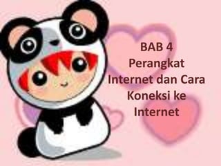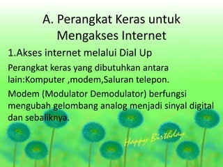 Dokumen tersebut membahas tentang perangkat keras dan lunak yang dibutuhkan untuk mengakses internet, meliputi modem, jaringan nirkabel, kabel jaringan, kartu jaringan, serta sistem operasi dan aplikasi browser. Juga dijelaskan cara koneksi ke internet menggunakan layanan telkomnet.