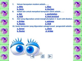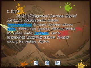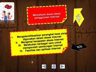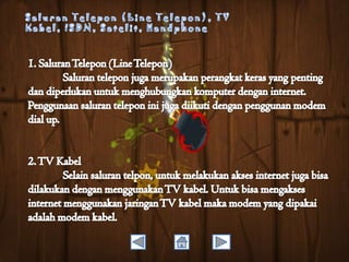 Dokumen ini menjelaskan perangkat keras dan fungsinya yang diperlukan untuk mengakses internet, termasuk komputer, modem, dan perangkat jaringan. Terdapat juga informasi mengenai metode koneksi internet seperti dial-up, leased line, dan wireless, serta aplikasi internet penting seperti web dan email. Berbagai jenis browser dan fitur-fitur utamanya juga dibahas.