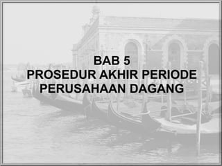 Dokumen tersebut membahas tentang prosedur akhir periode untuk perusahaan dagang yang meliputi penutupan akun-akun pendapatan, biaya, ikhtisar laba rugi, prive, membuat neraca saldo setelah tutup buku, dan membuat jurnal pembalik pada awal periode berikutnya.