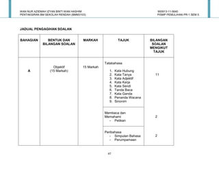 Dokumen ini menyajikan jadual pengagihan soalan dan spesifikasi ujian bagi pelajar tahun 4 dalam subjek bahasa Melayu untuk program pemulihan. Ia mengandungi pengiraan jumlah soalan mengikut kemahiran dan bentuk soalan untuk tatabahasa, membaca serta memahami, serta peribahasa. Selain itu, dokumen ini memberikan perincian tentang jumlah soalan objektif dan subjektif bagi setiap tajuk.