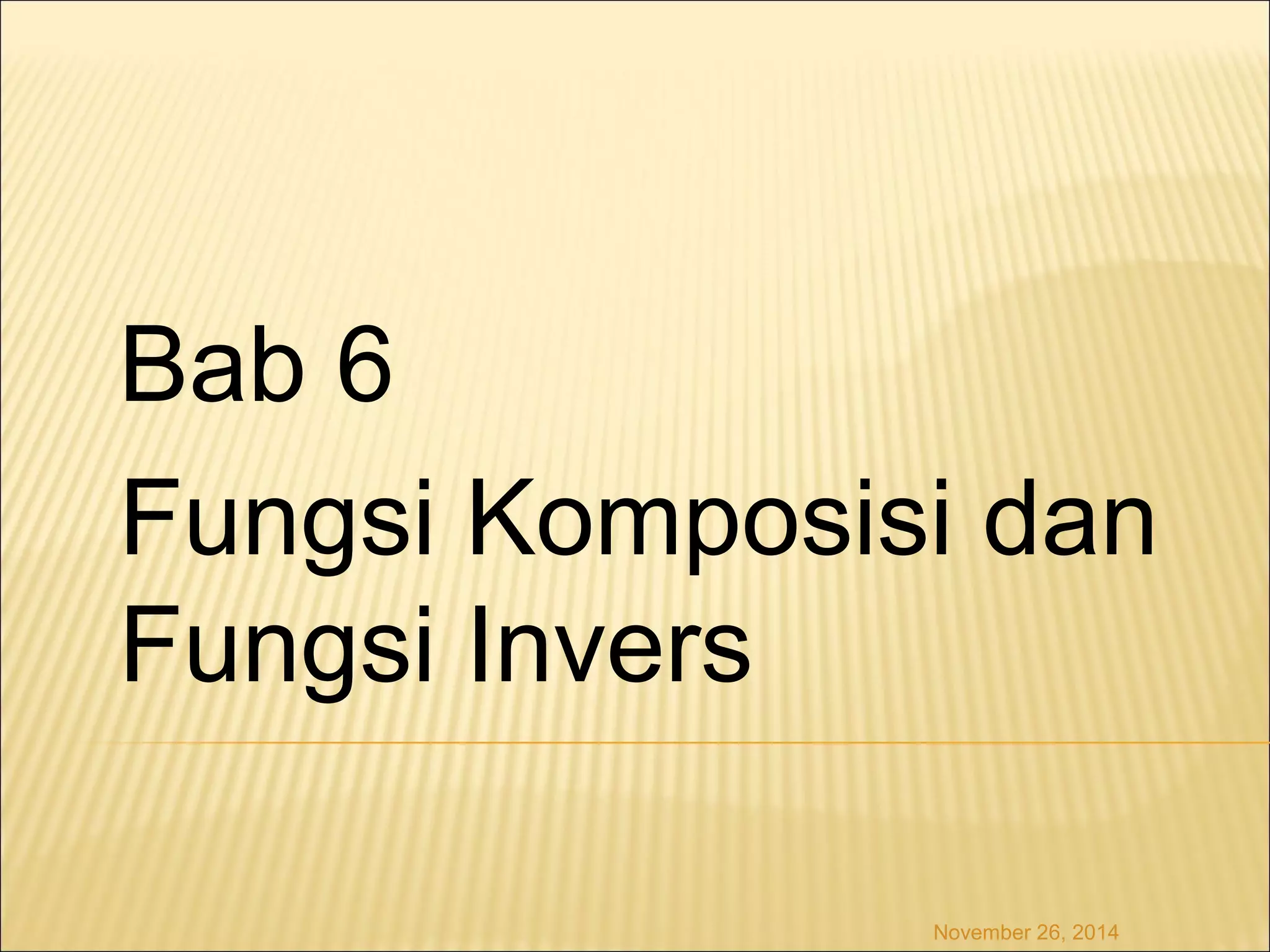 Bab 6 membahas fungsi komposisi dan fungsi invers, termasuk definisi, sifat-sifat, dan contoh-contoh penggunaannya. Fungsi komposisi merupakan komposisi dari dua fungsi atau lebih, sedangkan fungsi invers adalah fungsi terbalik dari suatu fungsi.