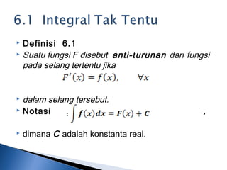 Dokumen tersebut membahas tentang integral tak tentu, notasi sigma, integral tentu, dan teorema dasar kalkulus. Secara ringkas, dibahas definisi integral sebagai anti turunan suatu fungsi, rumus integral, konsep partisi dan jumlah Riemann untuk menghitung luas daerah di bawah kurva grafik suatu fungsi, serta dua teorema dasar kalkulus yang menghubungkan antara turunan dan integral suatu fungsi.