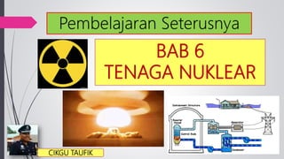 Dokumen ini membahas penggunaan tenaga nuklear dalam berbagai bidang seperti penjanaan listrik, militer, dan lainnya. Ia menjelaskan proses pembelahan nuklir dan pelakuran nuklir serta reaksi berantai yang menghasilkan energi. Dokumen ini juga membahas penggunaan bom atom di Hiroshima dan Nagasaki selama Perang Dunia Kedua.