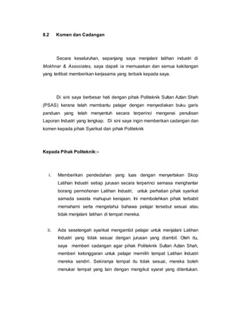 Dokumen ini membahas tentang komen dan cadangan pelajar mengenai pengalaman latihan industri di Mokhnar & Associates. Pelajar memberikan saran kepada pihak politeknik dan syarikat untuk meningkatkan pengalaman latihan, termasuk pendedahan jurusan, kelonggaran dalam pemilihan tempat latihan, dan perancangan tugas yang lebih baik. Secara keseluruhan, pengalaman pelajar memuaskan dengan kerjasama yang baik dari kakitangan.
