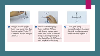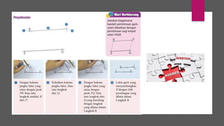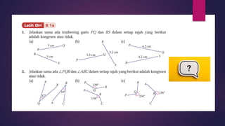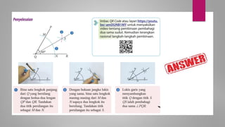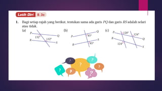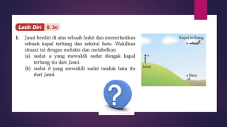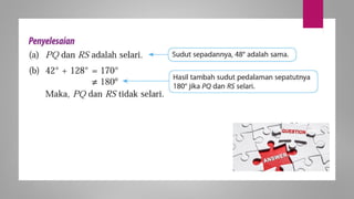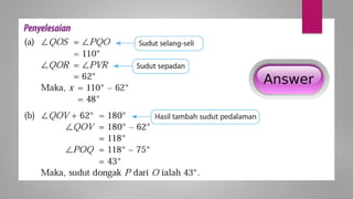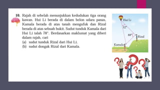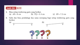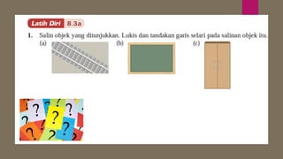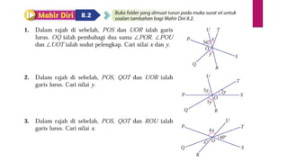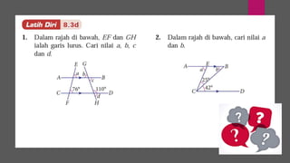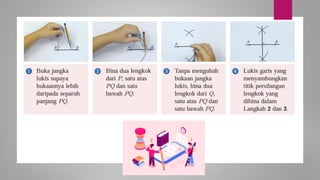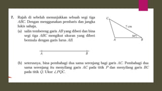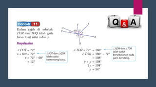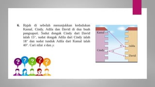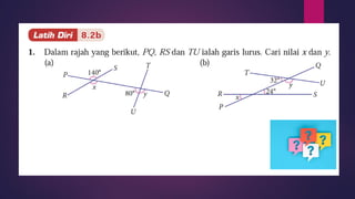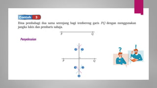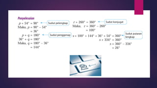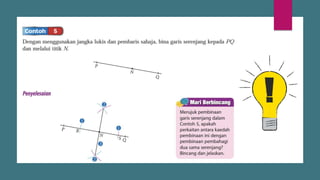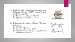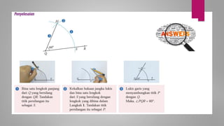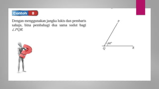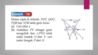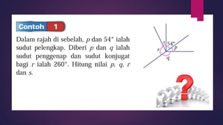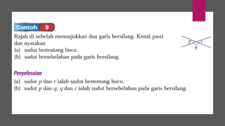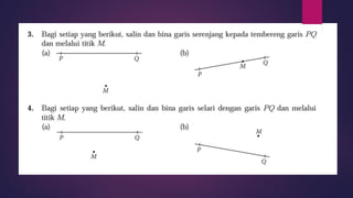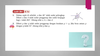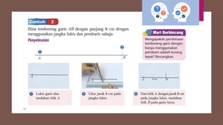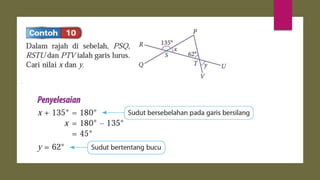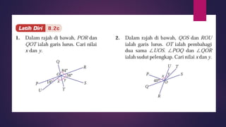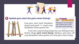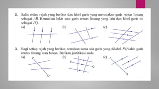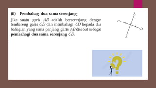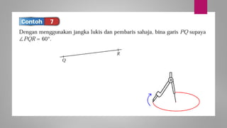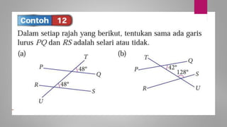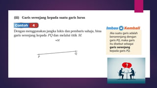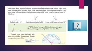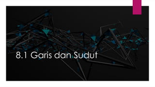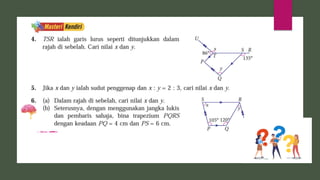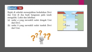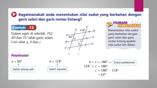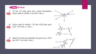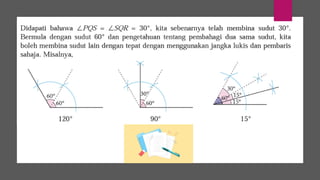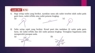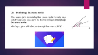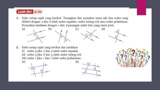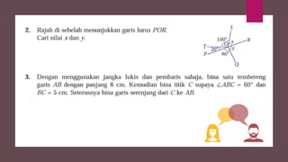 Dokumen ini membincangkan konsep garis dan sudut dalam matematik tingkatan 1 KSSM, termasuk sifat-sifat sudut seperti sudut pelengkap dan penggenap serta penggunaan alat geometri dalam pembinaan lukisan teknikal. Ia juga menerangkan cara untuk mengukur dan menganggarkan saiz sudut serta aplikasi sudut dalam pengukuran tanah. Pengetahuan tentang sudut dongak dan tunduk juga dijelaskan dalam konteks pandangan objek di aras berbeza.
