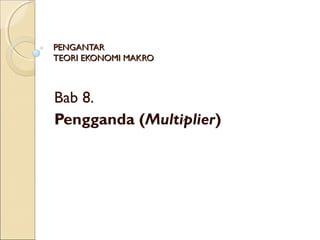 Dokumen ini membahas teori pengganda (multiplier) dalam ekonomi makro, termasuk variabel-variabel yang mempengaruhi pendapatan nasional serta cara menghitung berbagai tipe pengganda seperti konsumsi, investasi, dan pengeluaran pemerintah. Diharapkan mahasiswa dapat memahami dan menghitung dampak perubahan dalam faktor-faktor ini terhadap pendapatan nasional pada perekonomian terbuka dan tertutup. Terdapat juga latihan untuk memperdalam pemahaman tentang konsep-konsep ini.