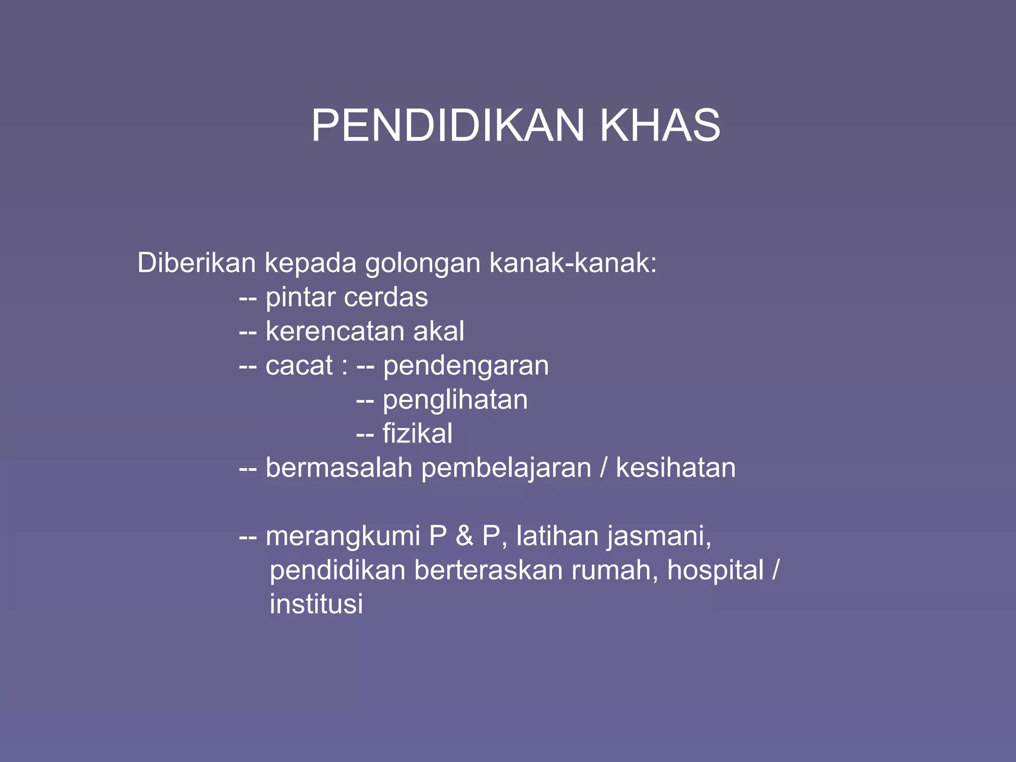Dokumen ini menerangkan tentang pendidikan khas untuk kanak-kanak yang mempunyai masalah seperti kerencatan akal, cacat pendengaran, penglihatan, dan pembelajaran. Ia membincangkan ciri-ciri, kaedah pengajaran, dan objektif pendidikan khas yang bertujuan memberikan peluang yang sama serta memupuk perkembangan individu. Terdapat juga penjelasan tentang program pendidikan inklusif dan pemulihan bagi menyesuaikan pelajar dengan keperluan khas.