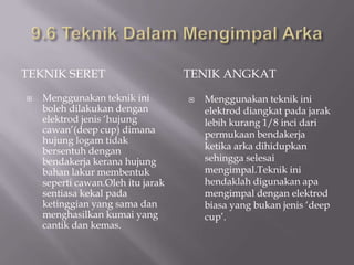 Dokumen ini menerangkan tentang mesin kimpalan arka, termasuk fungsinya, jenis-jenis mesin, dan komponen asas seperti alat pengubah dan elektrod. Terdapat juga perbincangan mengenai teknik pengimpalan, kekutuban mesin, jenis-jenis arus serta kelebihan dan kekurangan setiap jenis. Akhir sekali, dokumen membincangkan fungsi salutan elektrod dan jeremang, serta langkah-langkah untuk mencegah semburan arka semasa pengimpalan.