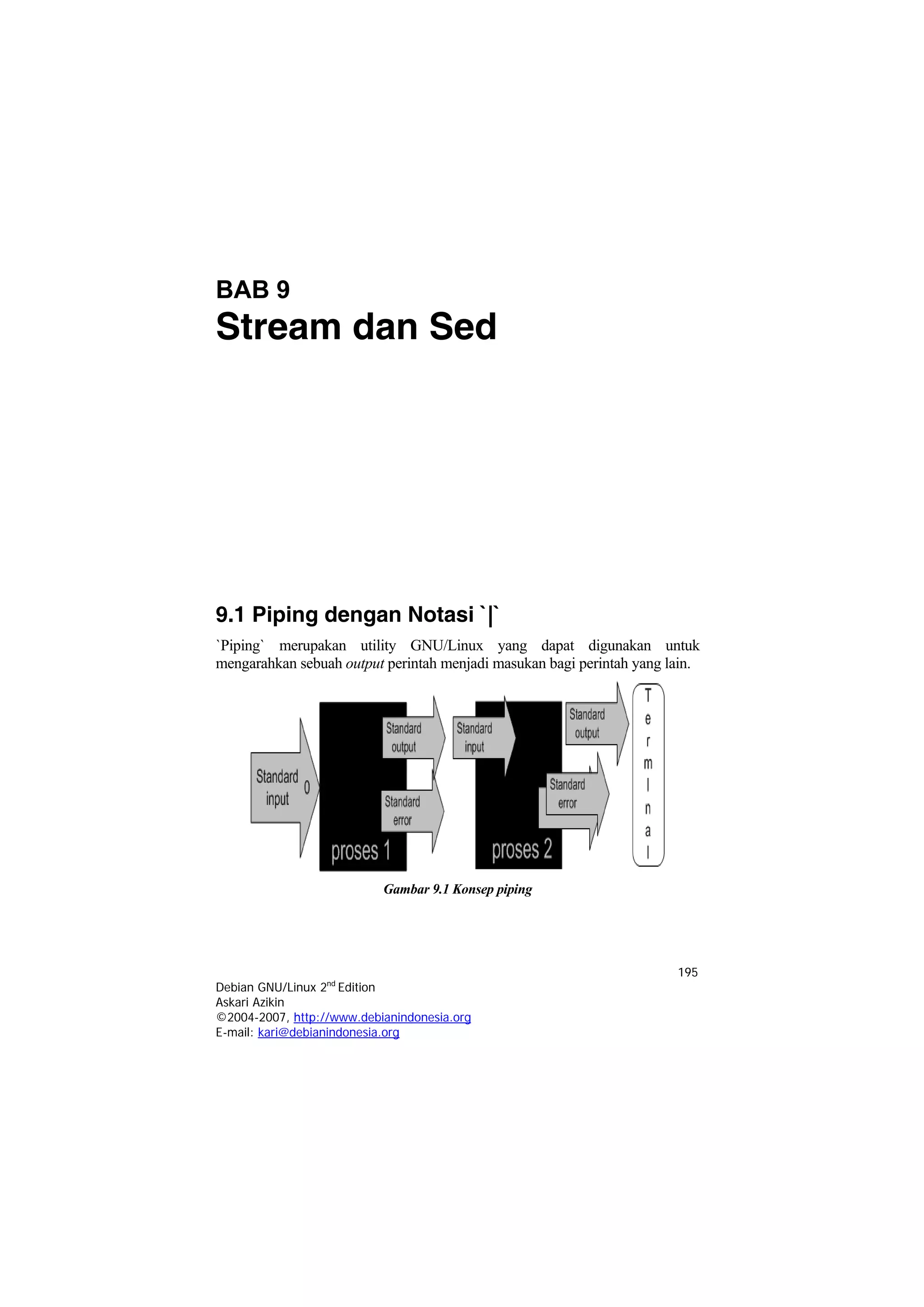 Dokumen tersebut membahas tentang piping dan redirection input/output pada sistem operasi Linux. Piping digunakan untuk mengarahkan output perintah satu sebagai input perintah berikutnya, sementara redirection digunakan untuk mengalihkan output ke file atau perangkat keluaran lain. Dokumen ini juga menjelaskan perintah-perintah seperti tee, sort, grep beserta contoh-contoh penggunaannya.