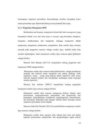 Dokumen ini membahas tentang manajemen sumber daya manusia (MSDM) sebagai ilmu dan seni dalam mengelola sumber daya manusia dan sumber daya lainnya untuk mencapai tujuan organisasi. MSDM mencakup fungsi-fungsi seperti perencanaan, pengorganisasian, pengarahan, dan pengendalian, yang semuanya berfokus pada pemberdayaan karyawan untuk mencapai efektivitas dan efisiensi kerja. Selain itu, disiplin kerja juga dianggap penting dalam memastikan karyawan mematuhi peraturan dan berkontribusi pada pencapaian tujuan perusahaan.